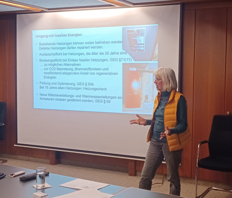 Die Architektin Andrea Klein führte aus, welche Nachrüstverpflichtungen der Staat bei Eigentümerwechsel vorsieht, z. B. Dämmung der Decke zum Speicher oder Dämmung der Leitungen im Heizungskeller.